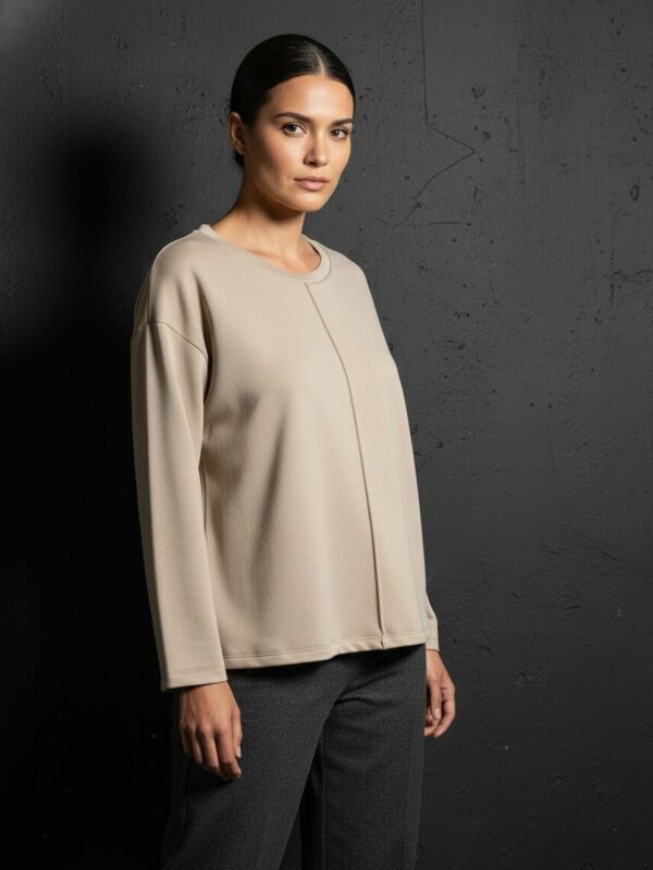 La Bella Suéter nos permite jugar con una estética de hilado sin recurrir al tejido tradicional. Al no ceder tanto, genera estructura, volumen controlado y siluetas como murciélagos y saquitos amplios que aportan presencia sin perder comodidad.